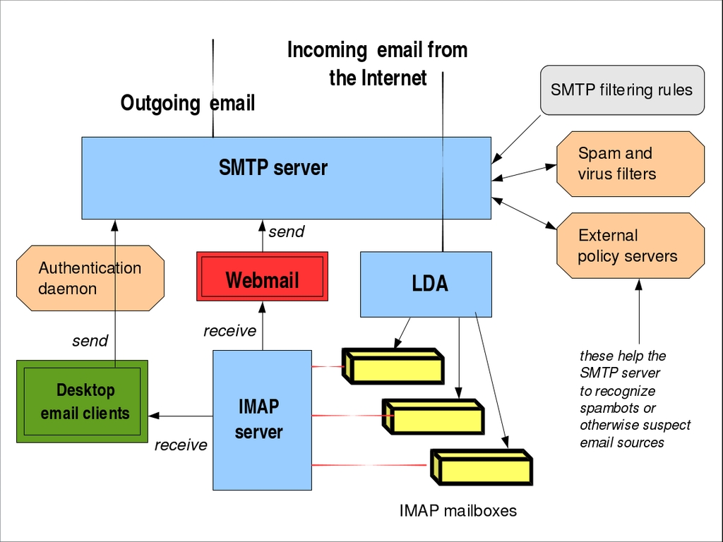The SMTP server is the piece that uses the Simple Mail Transport Protocol to accept legitimate e-mail from the outside world or to ship all the messages from authorized users, no matter how they were sent, to their final destinations. This server is assisted by several dæmons that help block spam, viruses or otherwise unwanted connections. Outgoing messages from external clients are accepted and relayed only after an authentication procedure.