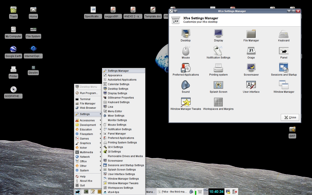 Desktop Settings and Screensaver let you select the desktop background (solid colors or gradients, or an image) and screensaver, along with some behavior aspects, such as the meaning of a middle- or right-click (the defaults are showing the window list and showing the desktop menu, respectively) or what kinds of icons (if any) will be shown.