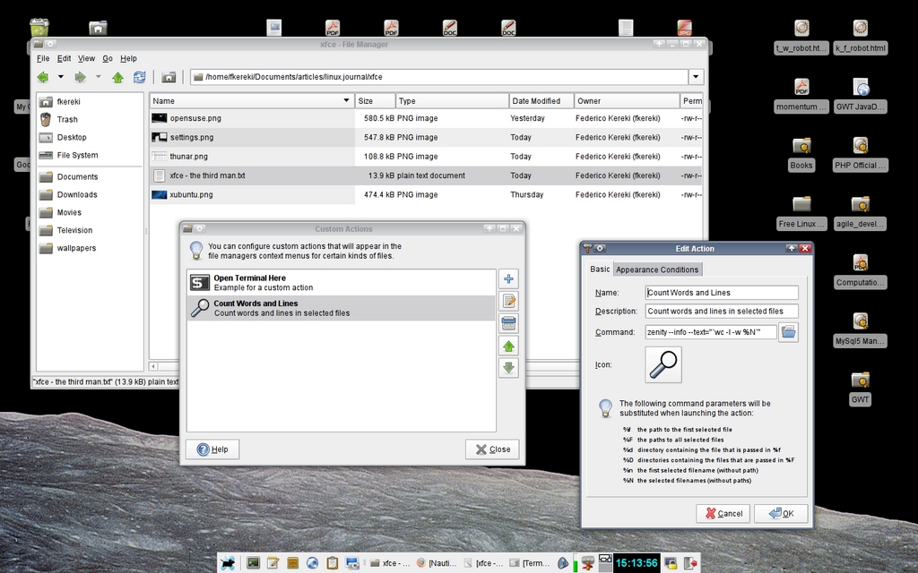 Thunar provides extra customization possibilities, allowing you to define personal commands. Click Edit→Configure custom actions, and you can create an action of your own. To test it, I added a “Count Words and Lines” feature (Figure 3). I set Name to Count words and lines, and Command to: