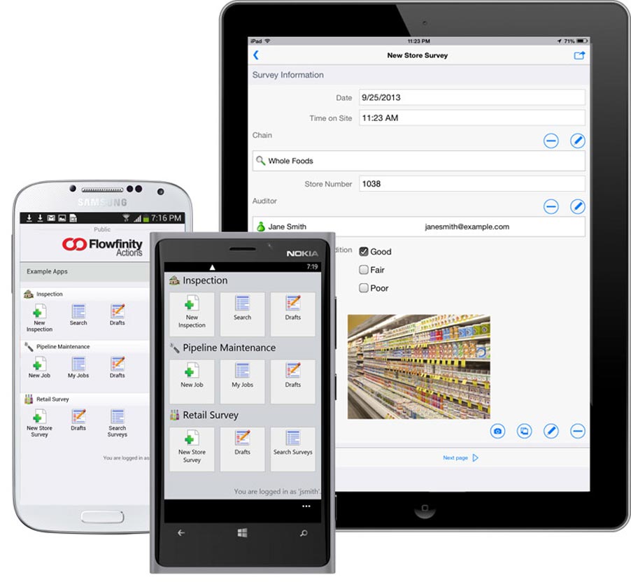Empowering employees to be more productive everywhere, whether in or out of network coverage, is Flowfinity Wireless Inc.'s "mission possible" with Flowfinity Actions. Flowfinity Actions 7.5 is the latest version of the firm's flexible application software that supports cross-platform enterprise app creation without programming. The premier improvement in this latest release is the ability for users to save current progress and switch between multiple Flowfinity apps with or without network connectivity. This is especially useful when performing data collection tasks, such as pipeline inspections, agricultural management and remote construction site reporting, which require diverse information to be gathered or accessed when no Internet connection is available. Another new off-line feature is parameter or filter-based search, enabling users to filter through thousands of records quickly to find the information they need at any time. Finally, lookups that allow information to be stored in one app and copied into another app also are fully supported off-line.